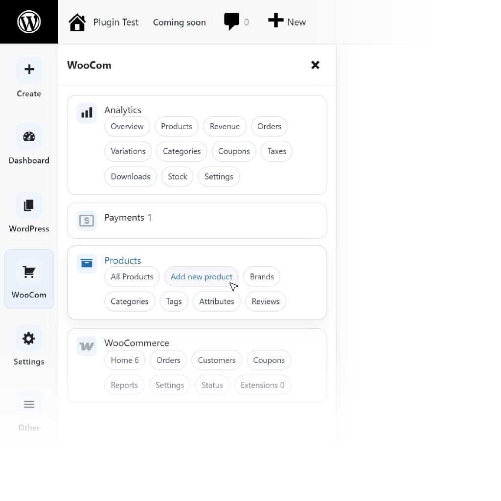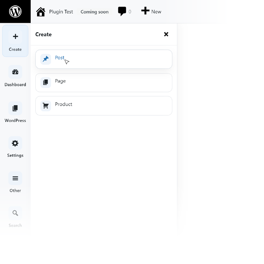 One “+ Create” panel for Posts, Pages, Products, and every custom post type.